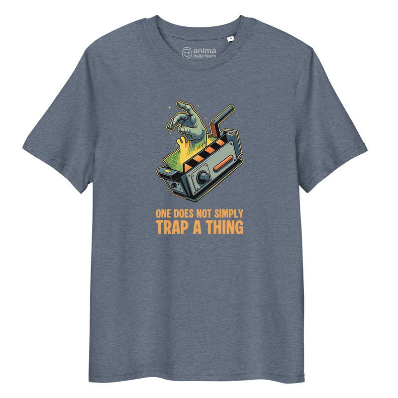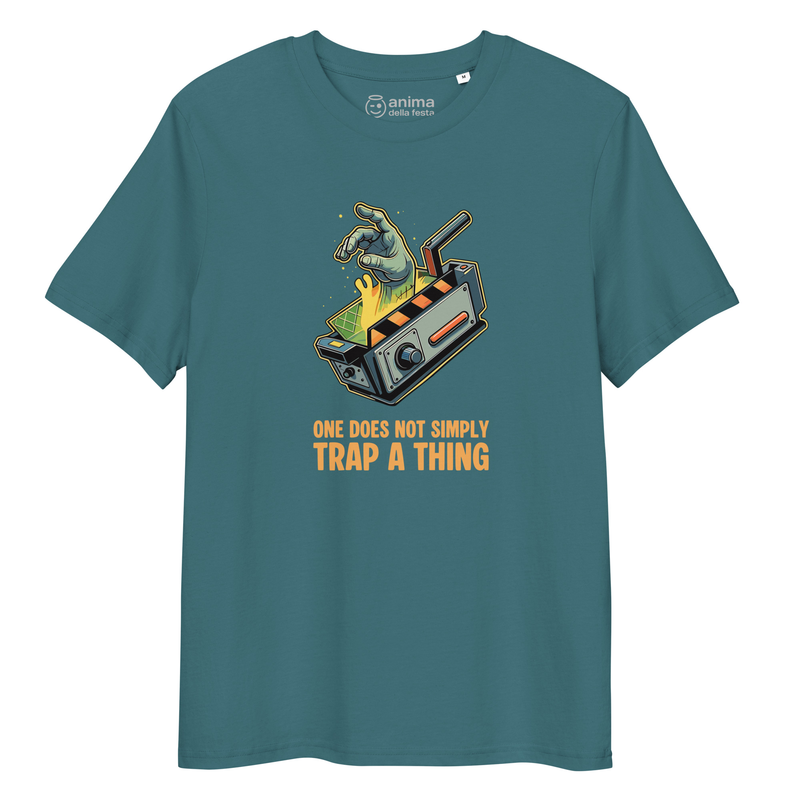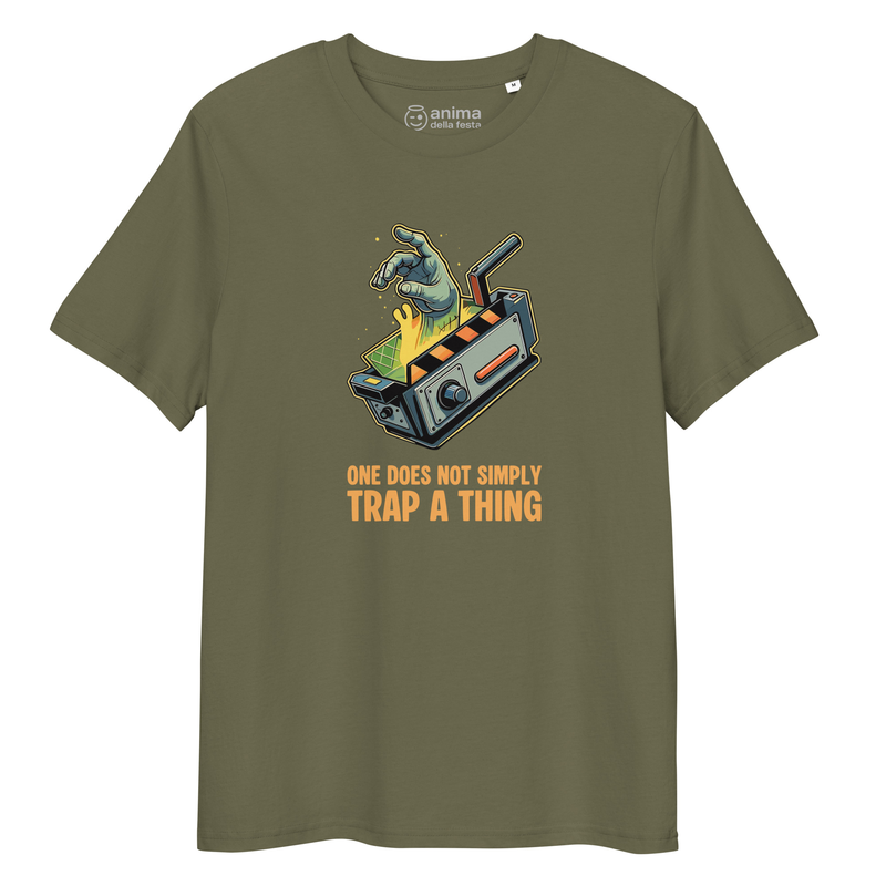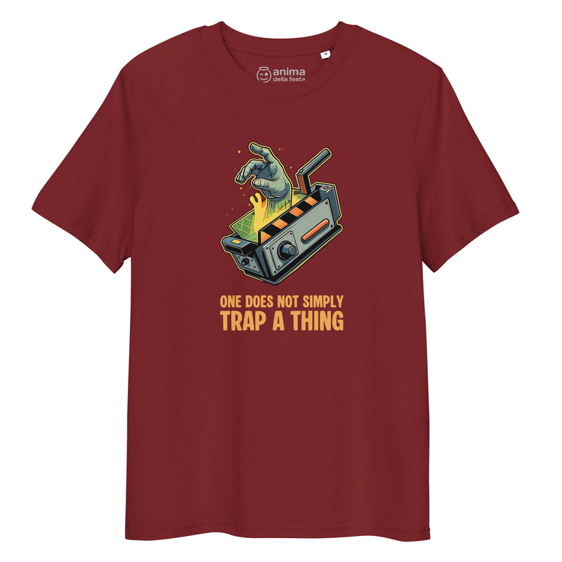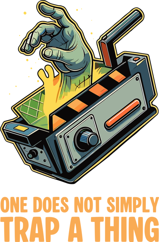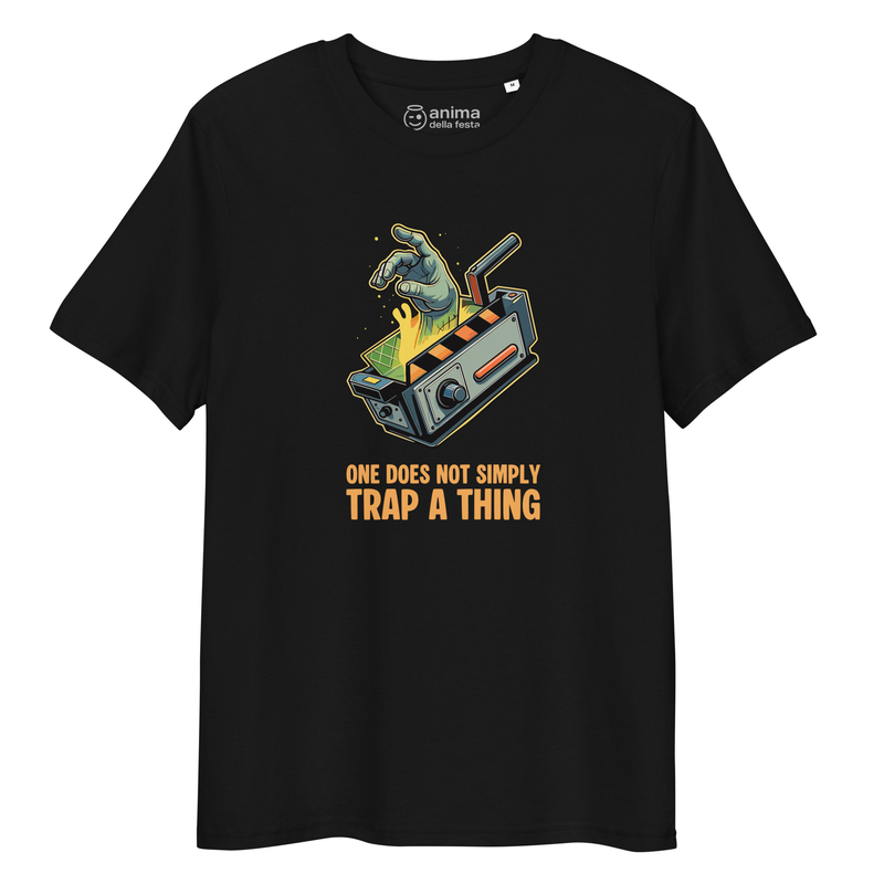 This funny T-shirt combines the iconic Ghostbusters ghost trap with Thing from The Addams Family, complete with a witty meme twist: “One does not simply trap a Thing.”