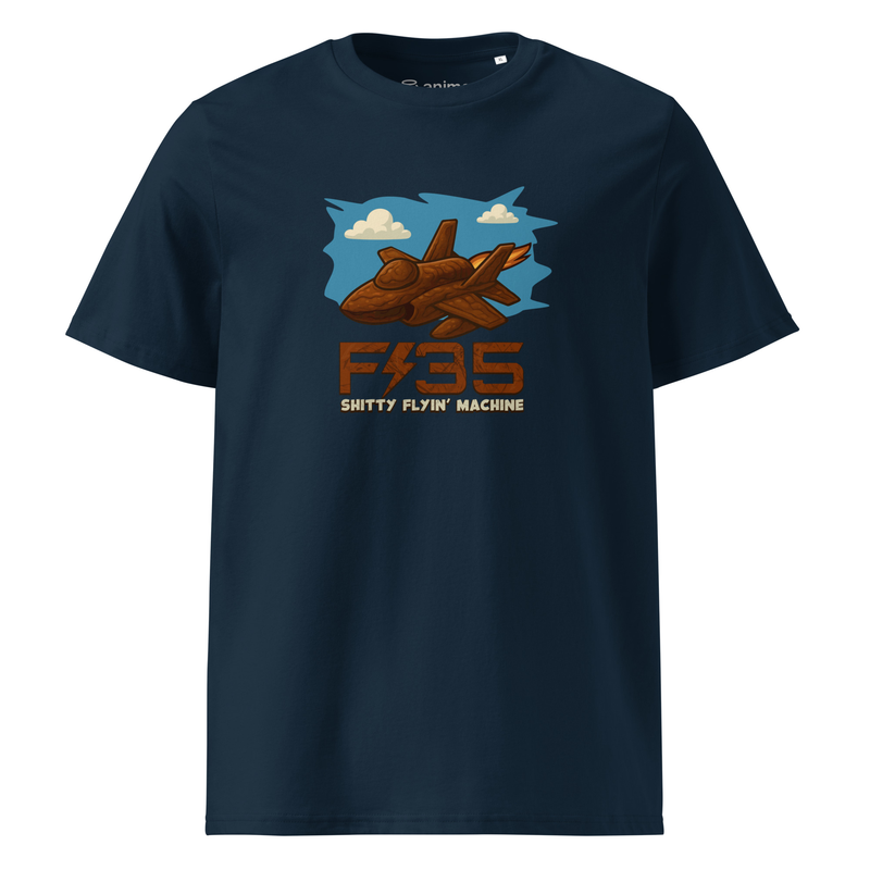 This F-35 parody shirt turns the infamous stealth jet into a wooden “shitty flyin’ machine,” poking fun at its endless defects, outrageous costs, and the deafening noise it blasts over neighborhoods.