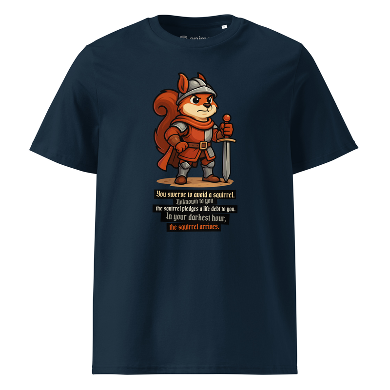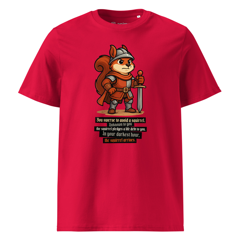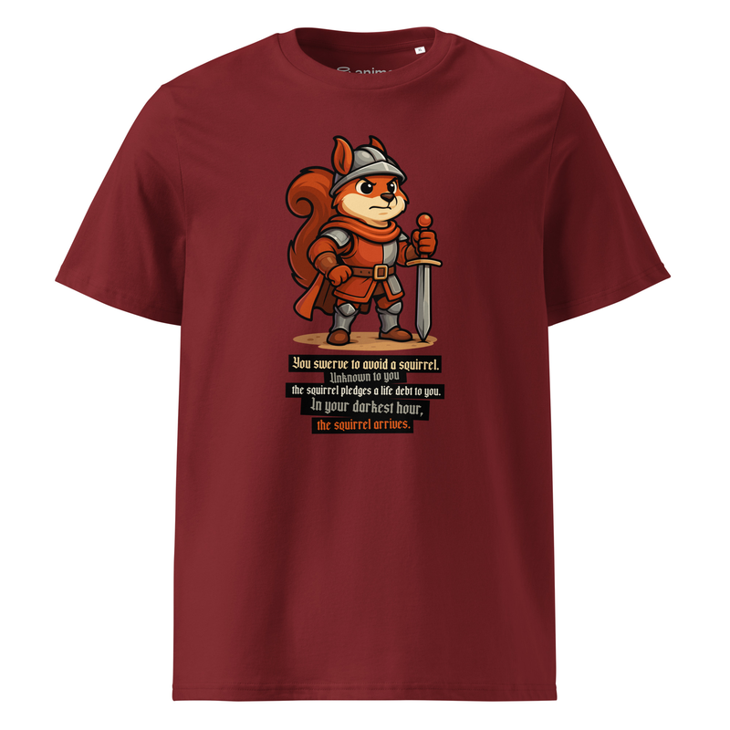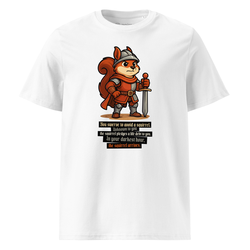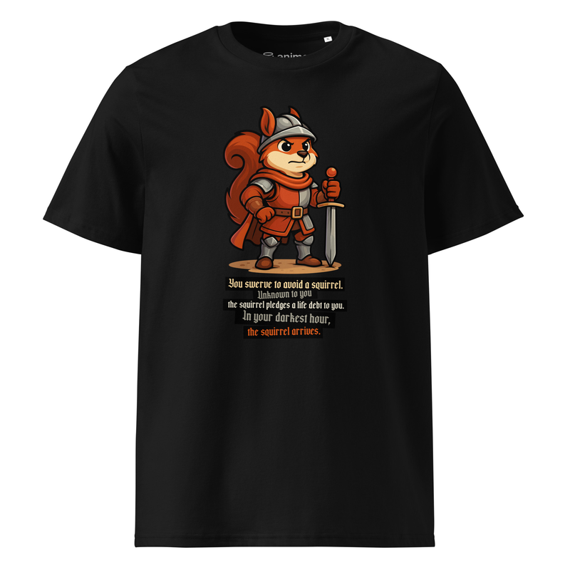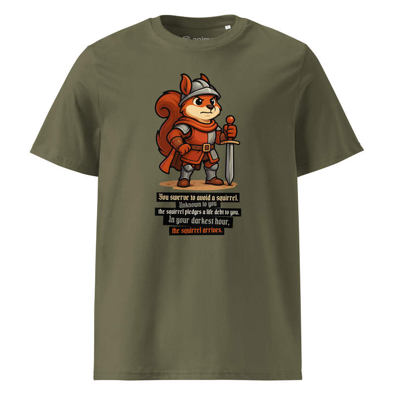 Featuring a mighty squirrel warrior in full armor, this tee is the perfect mix of epic fantasy and internet humor.