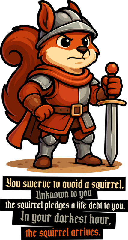 “You swerve to avoid a squirrel. Unknown to you, the squirrel pledges a life debt to you. In your darkest hour, the squirrel arrives.”
