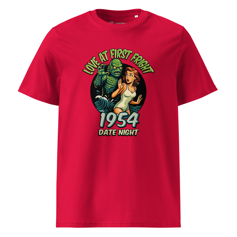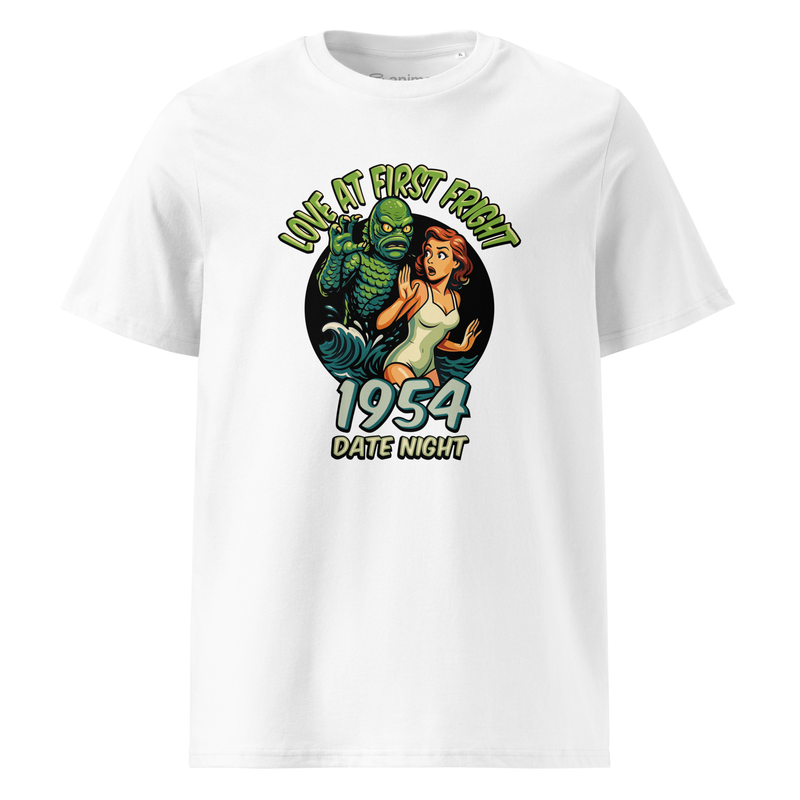 This 1954 Date Night parody tee reimagines the classic Creature from the Black Lagoon in a playful retro-romantic style. With the line “Love at First Fright”, it’s the perfect mix of vintage horror and quirky humor—ideal for monster movie fans, Halloween lovers, and anyone with a taste for cult classics.