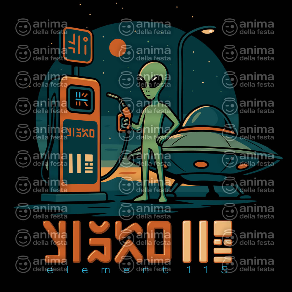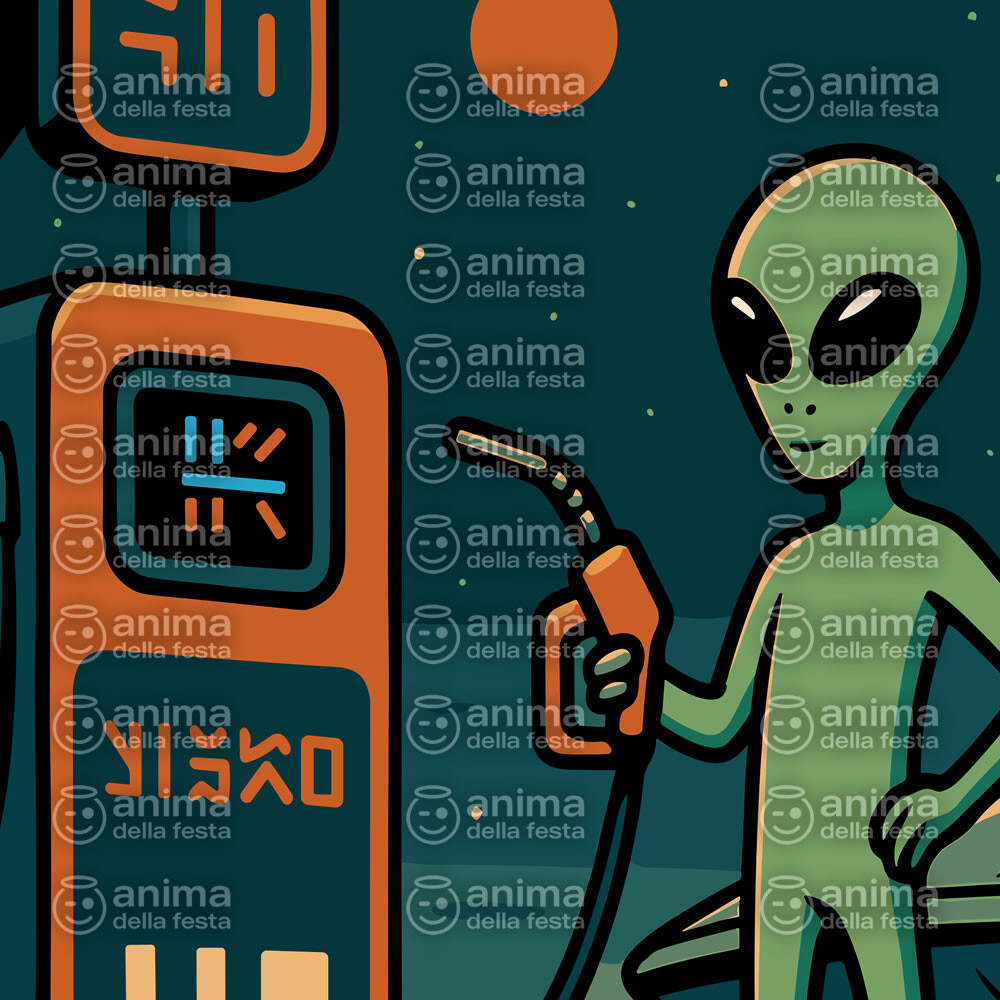 Somewhere between Area 51 and a vintage gas station, this chill alien tops off his saucer with Element 115 — the most mysterious (and probably most expensive) fuel in the galaxy.