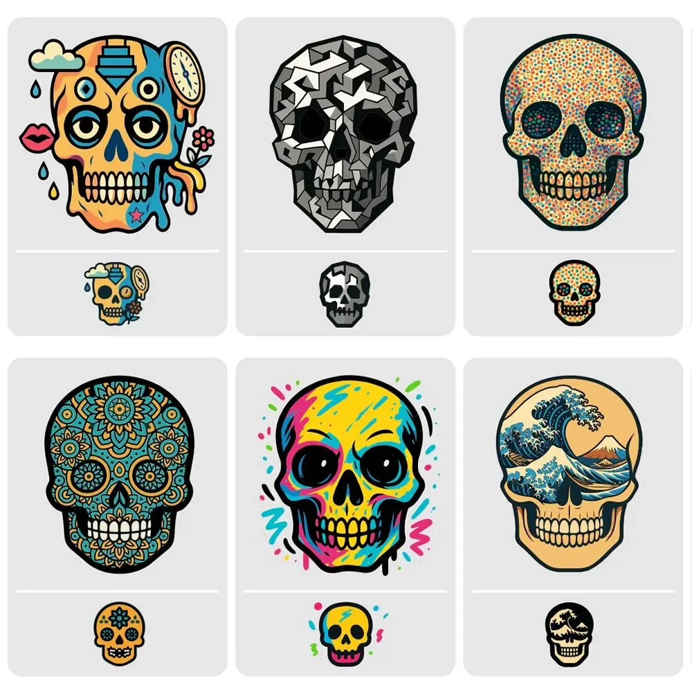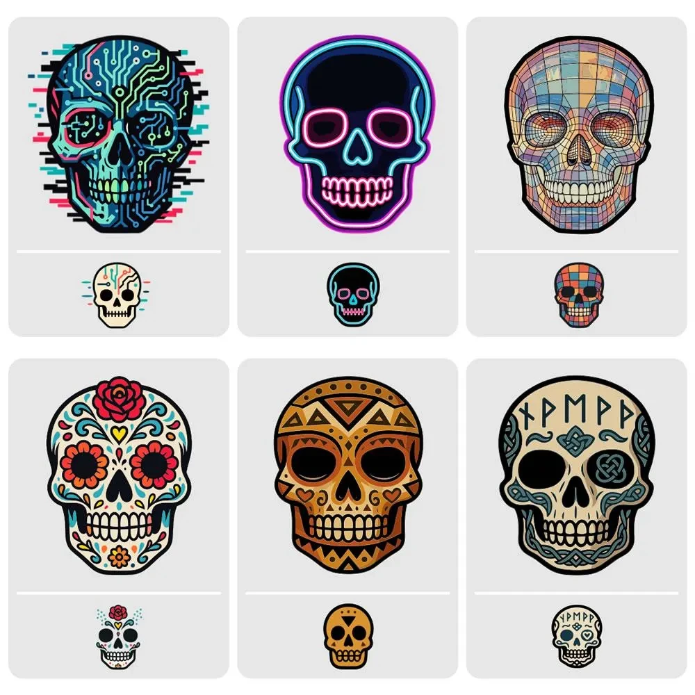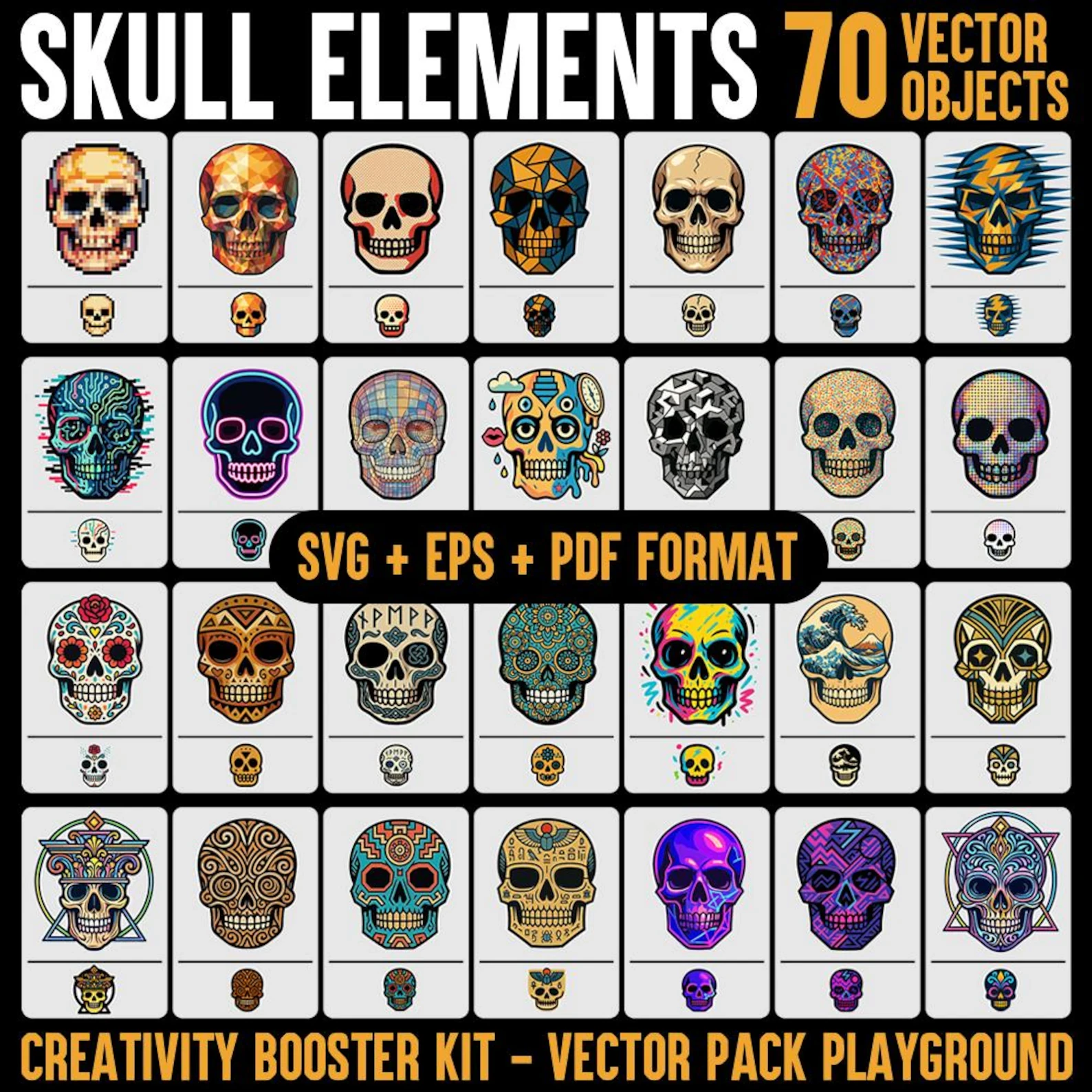 This collection includes 70 unique skull designs, each crafted in a different retro-illustration vector style — from geometric and pop-art to sugar skulls, vaporwave, and cyber glitch.